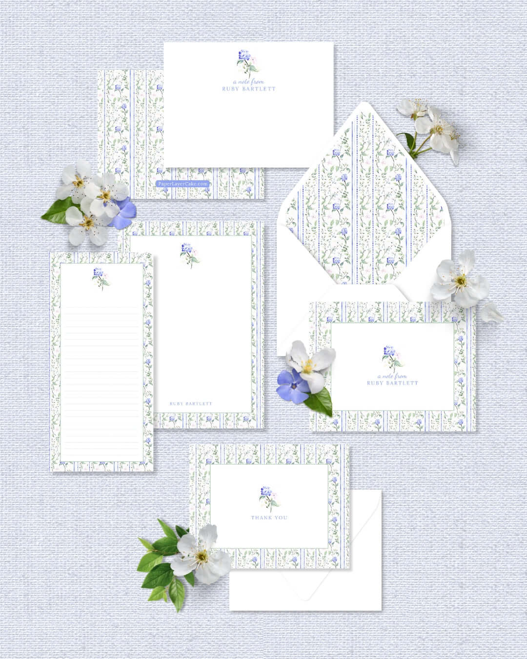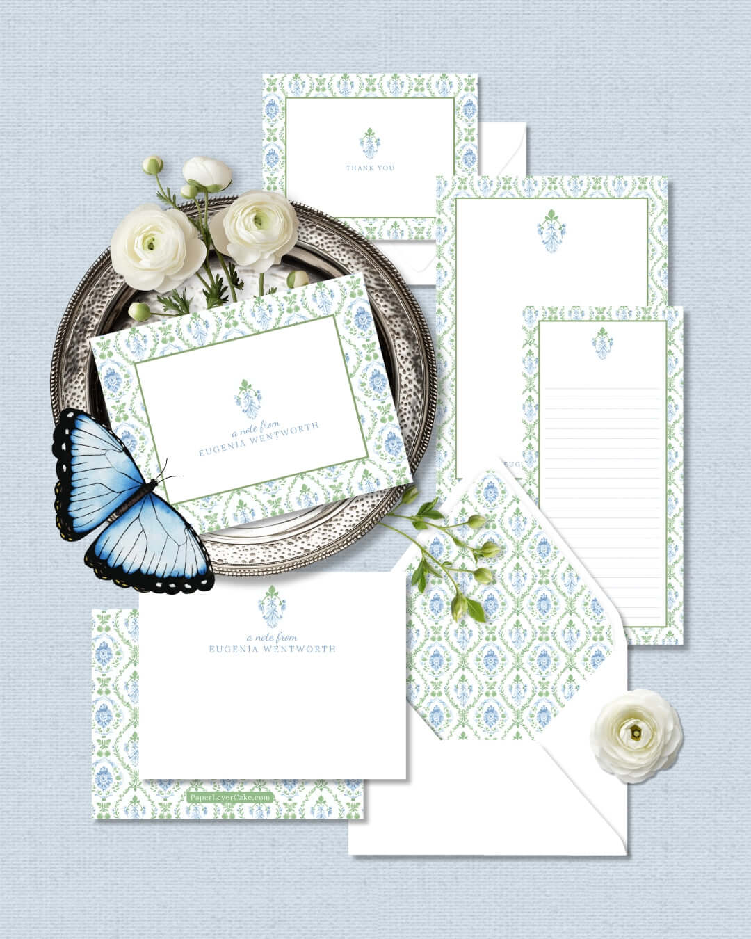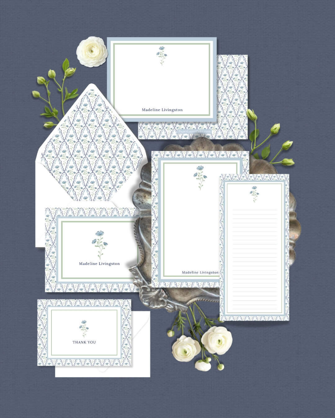 Welcome to the curated collection of Paper Layer Cake’s signature stationery suites—each named after a charming grandmillennial muse and adorned with delicate florals, timeless patterns, and vintage-inspired details. From personalized flat notes and folded cards to coordinating notepads and list pads, every suite is thoughtfully designed to blend heirloom elegance with everyday functionality. Whether you’re writing a thank-you, sending a quick hello, or gifting something meaningful, you’ll find a suite that speaks to your style.